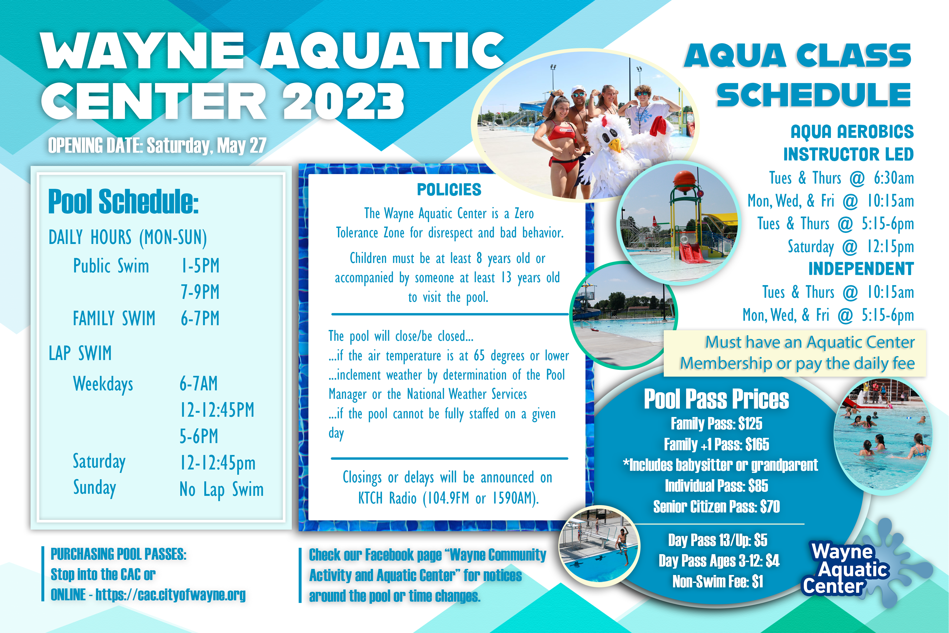 Check the Aquatic Center's Facebook page for closures or time changes throughout the season due to weather or other circumstances. Notices will also be announced on KTCH radio station (104.9 FM, 1590 AM).